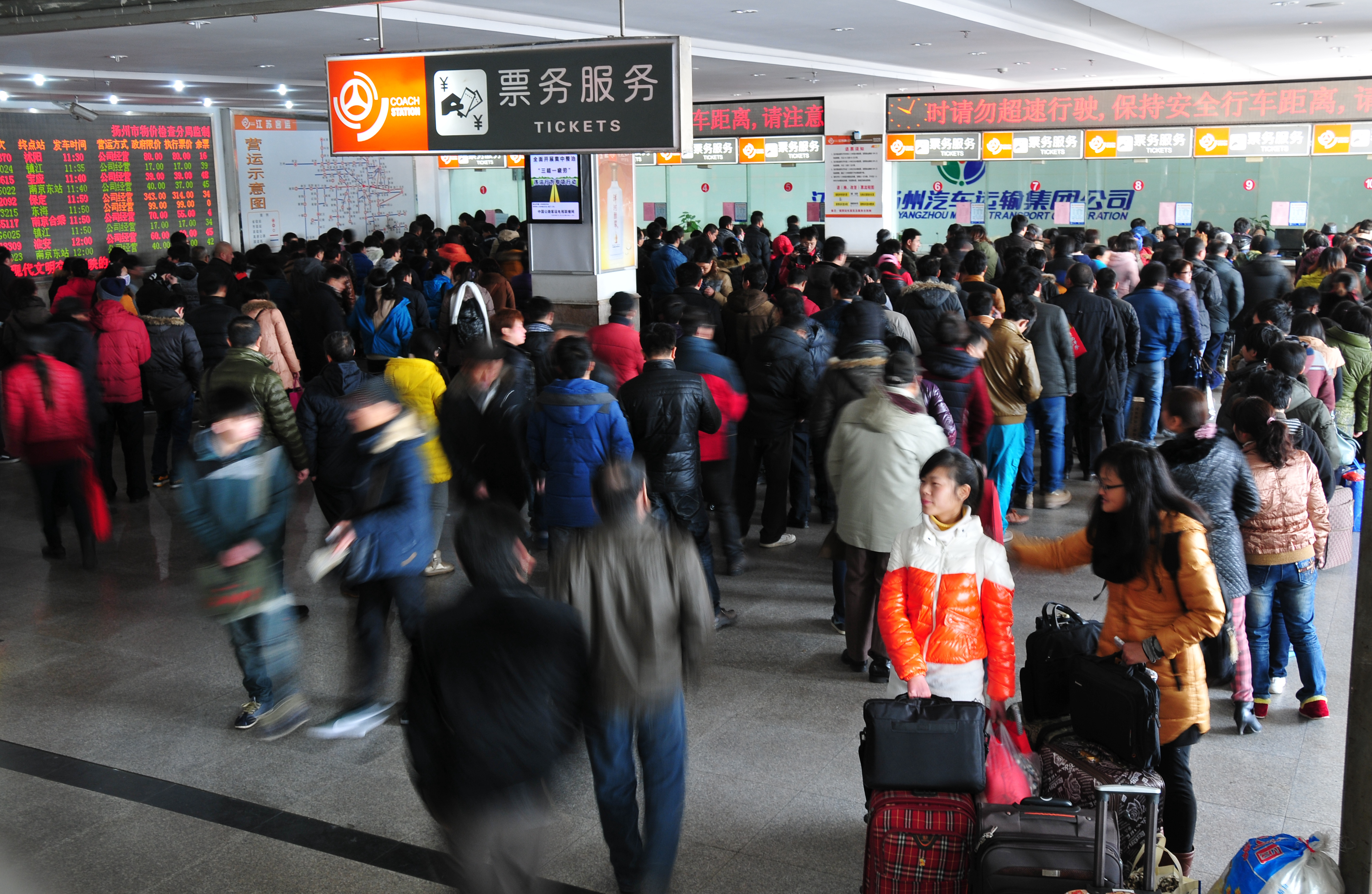 為應(yīng)對(duì)旅客購票高峰壓力,揚(yáng)州汽車站打開了10個(gè)售票窗口,汽車東站打開了7個(gè)售票窗口,另外還使用了自助售票機(jī)、配備了退票專窗、手機(jī)換取票專窗。為方便民工返鄉(xiāng),車站還主動(dòng)聯(lián)系揚(yáng)州晚報(bào)推出“民工返鄉(xiāng)直通車”,集中為市區(qū)周邊廠礦工地的民工兄弟團(tuán)體預(yù)訂了近萬張汽車票。