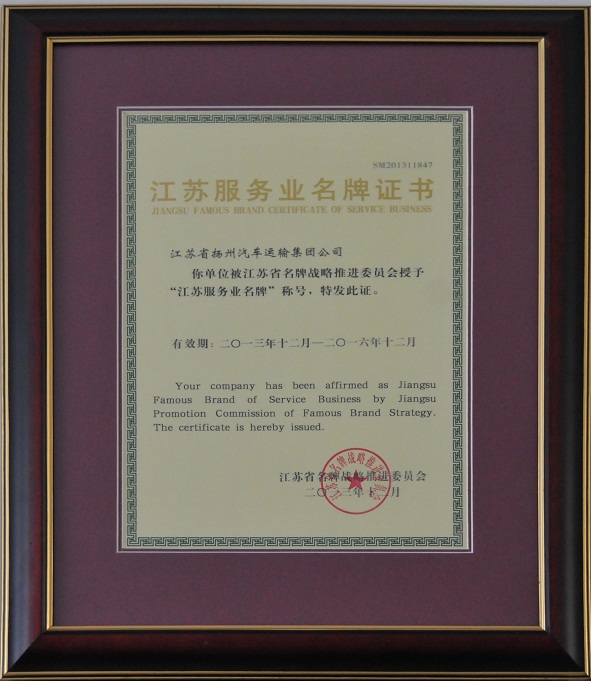 日前,由江蘇省名牌戰(zhàn)略推進(jìn)委員會(huì)綜合評(píng)價(jià)并經(jīng)全體委員會(huì)議審議通過,集團(tuán)公司被授予“江蘇服務(wù)業(yè)名牌”稱號(hào),有效期三年。