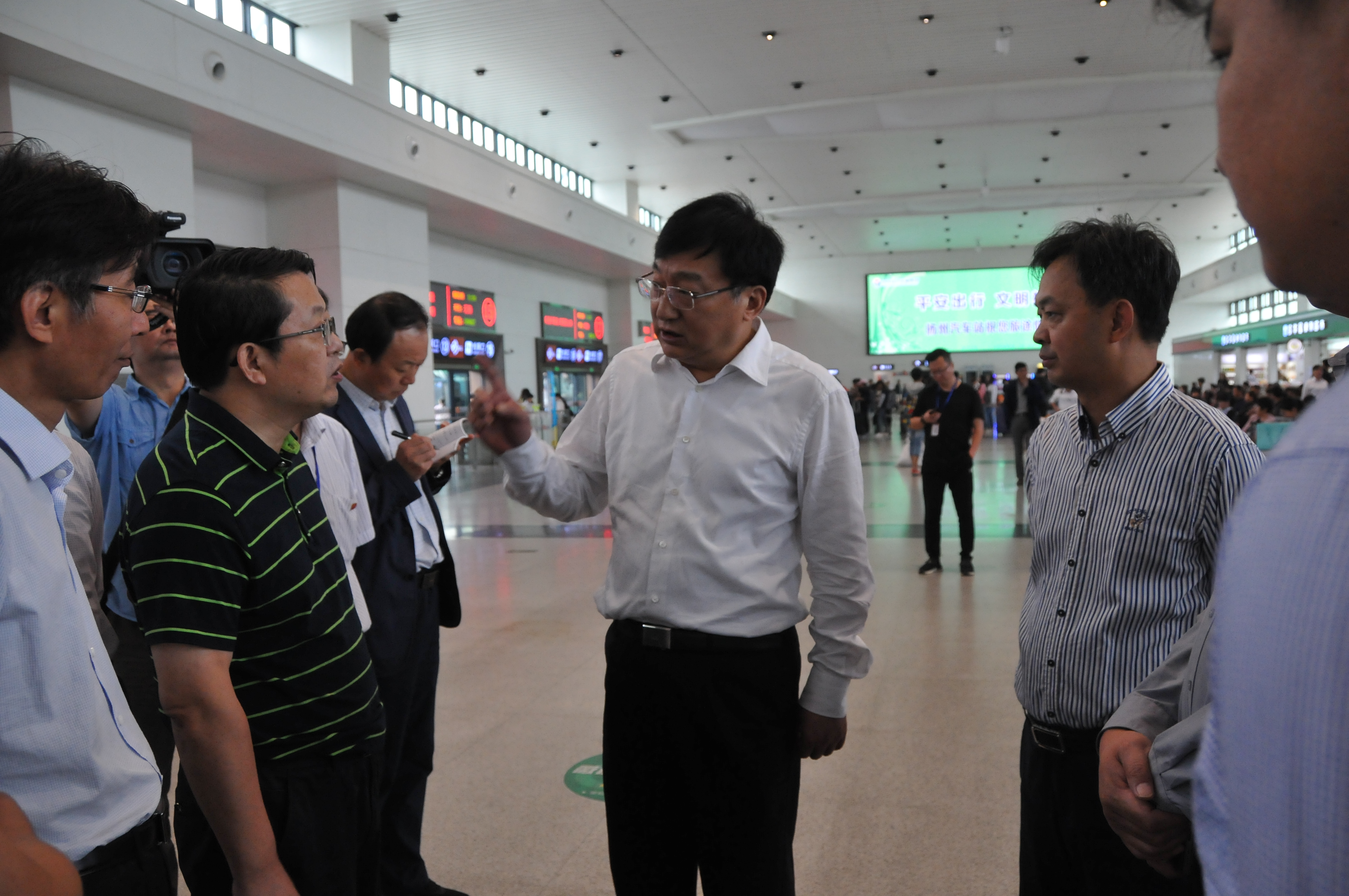 9月30日上午,揚(yáng)州站人流如織,車站已經(jīng)提前進(jìn)入節(jié)日運(yùn)輸模式。上午11時(shí)許,揚(yáng)州市副市長丁一帶領(lǐng)相關(guān)人員來到西部樞紐揚(yáng)州客運(yùn)站,檢查節(jié)日安全工作。揚(yáng)州市交通局局長徐斌,揚(yáng)州市交通產(chǎn)業(yè)集團(tuán)董事長、總經(jīng)理、黨委書記凌衛(wèi)東,揚(yáng)汽集團(tuán)黨委書記、副總經(jīng)理韓滿陵等陪同。