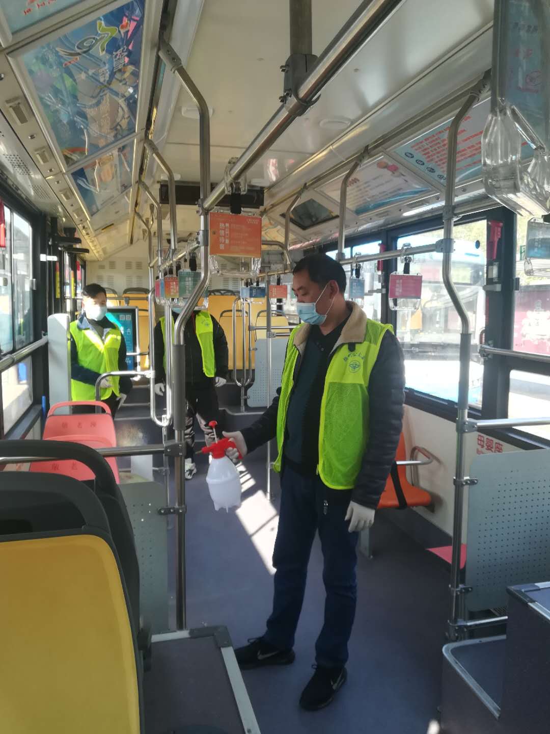 崗前培訓后,志愿者們分工明確,在公交站的志愿者們拎著手持噴壺對待恢復營運線路車輛的地面、扶手、座位進行消毒工作,確保做到不留死角;在車站的志愿者們,協(xié)助車站工作人員做好旅客引導工作,測量體溫、以及掃碼登記等。